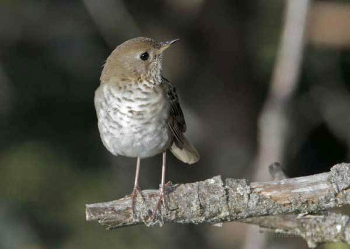 The Bicknell's thrush is difficult to see, but easy to hear. It likes to sing from the tops of dead trees that stand high above other trees and shrubs. It is a small bird at only 6-7.5 inches. The Bicknell's Thrush has an olive brown head, back and wings, whitish-gray belly with brown spots.