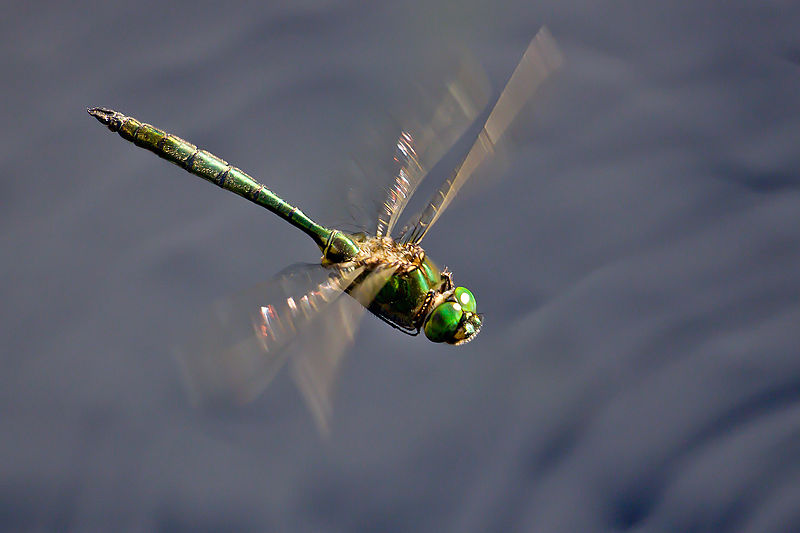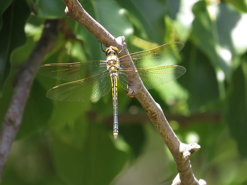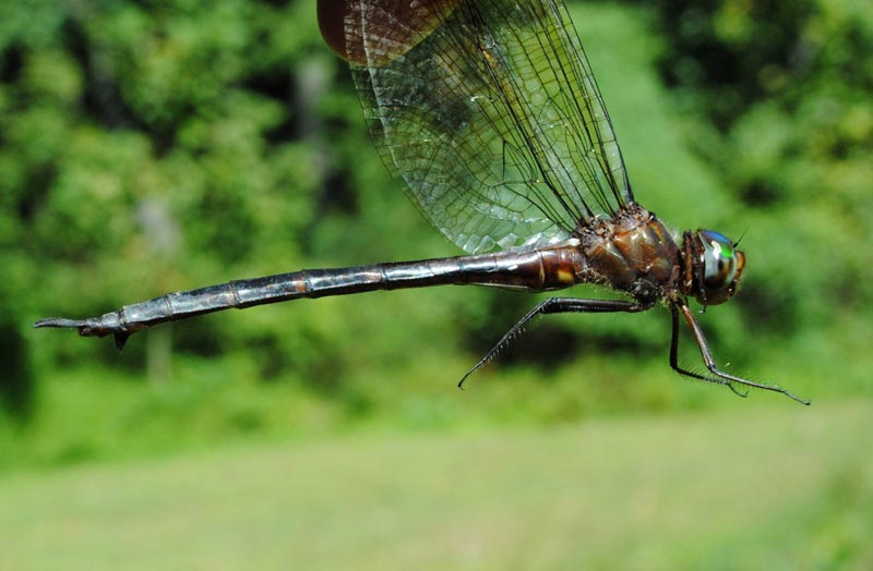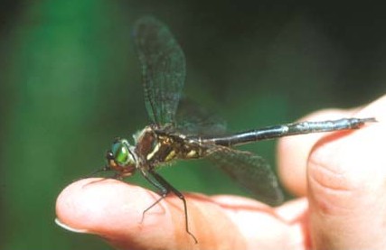 The dragonflies in this family are large, usually between 1.5 and 3 inches in length. They have bright green eyes, and many species are black with metallic green or yellow markings.