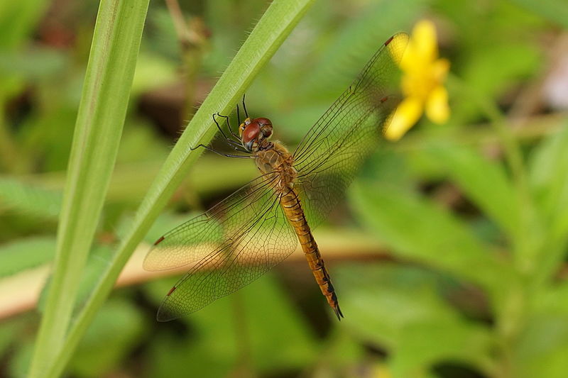 The saffron-winged meadowhawk is found near ponds and lakes and sometimes bogs.