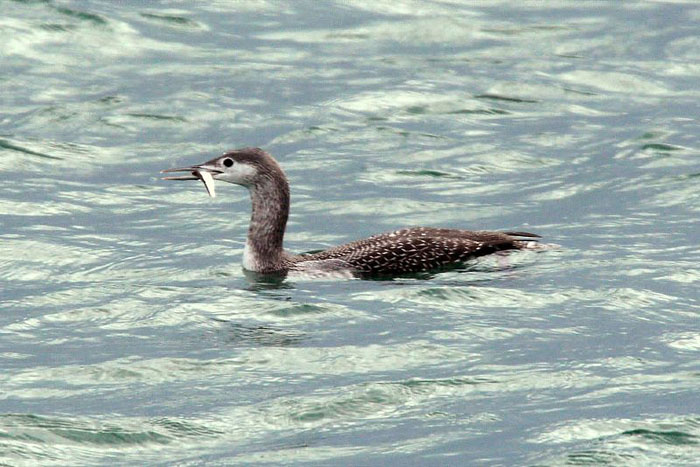 The Red-throated Loon only hunts in marine waters, never in the freshwater ponds and lakes used for nesting. It locates prey visually, needing clear water to find fish as they swim by. The Red-throated Loon dives to retrieve its food, which is mostly small to medium-sized fish. It sometimes eats crustaceans, mollusks, frogs, fish eggs and insects.