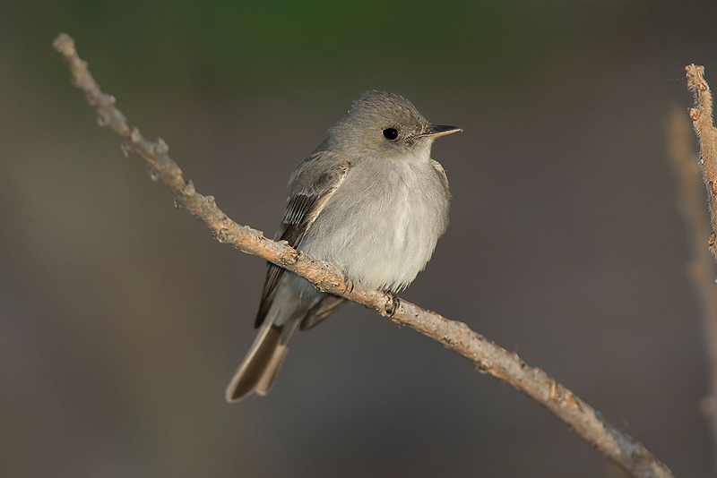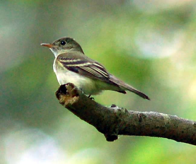 The Acadian flycatcher is a small flycatcher. It is around 5 inches in length. It has greenish-brown upperparts, a grayish-white throat, a white lower breast, a light yellow belly, white wing bars, and a white rings around its eyes. Males and females look alike.