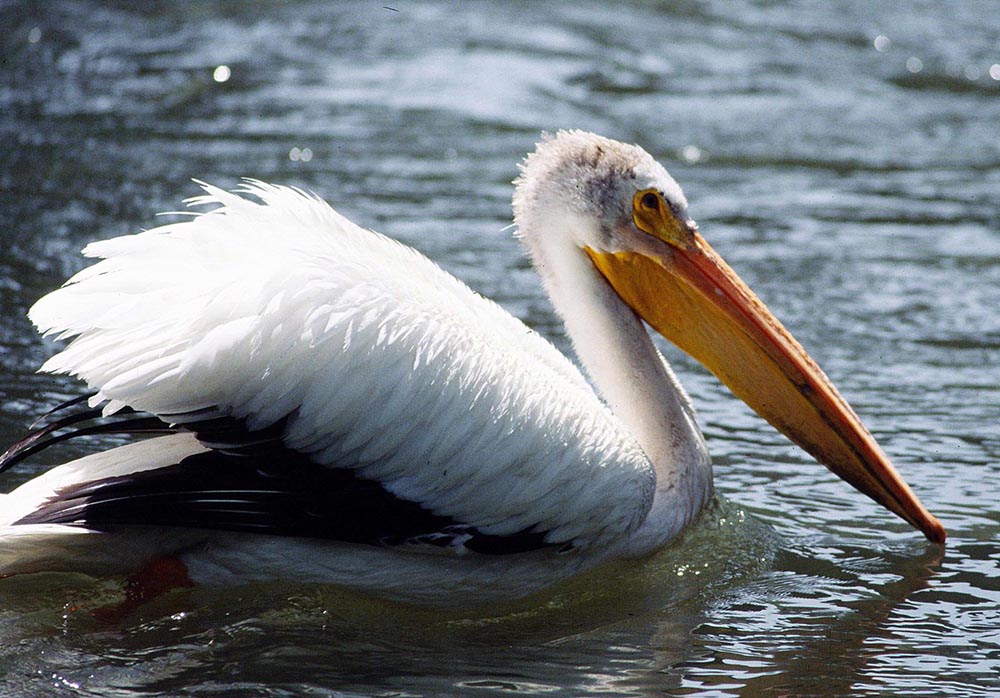 In breeding season, it has a light yellowish crest on the back of its head and a nuptial tubercle or fibrous plate on the upper part of its bill. The nuptial tubercle falls off when mating season is over and the crest turns gray. Young American white pelicans have grayish markings on their heads and backs.