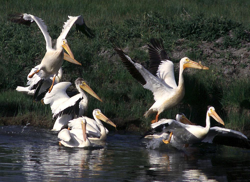 The American white pelican lives on inland shallow freshwater lakes, wet prairies, and marshes in the summer and on coastal lagoons in the winter.