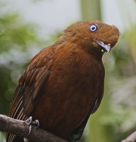 Andean cock-of-the-rock males gather in groups in a lek in the forest. A lek is an area where animals, usually birds, gather to perform courtship displays. The males try to attract females with a call that sounds like a pig squealing! They also bob up and down, bow, and hop around to display their bright plumage. Males will mate with more than one female. The female builds a nest of mud under a rocky outcrop or in a cave. She lays 2 eggs and incubates them for around 28 days. She cares for the chicks by herself.