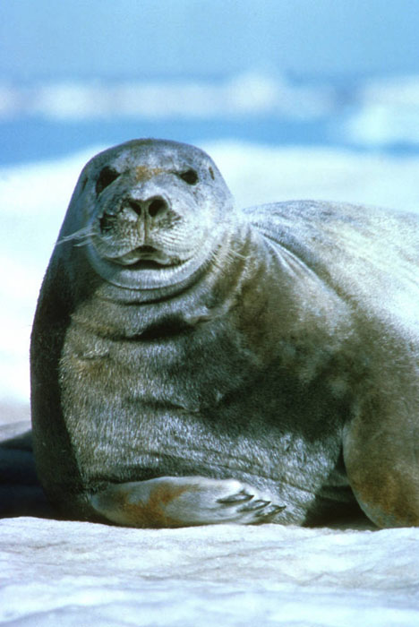 The bearded seal has gray to brown fur and squared-off front flippers with strong claws that it uses to open breathing holes in the ice. It has a round head; small eyes; and and a large, wide muzzle with bristly white whiskers.