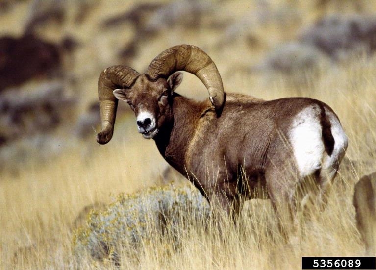 Description The bighorn sheep has tan or brown fur. It has a white belly, rump, and muzzle. It is best known for its large horns. The ram has large, thick curving horns.