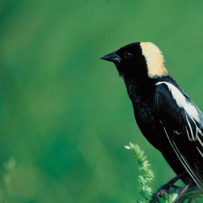 During breeding season, the Bobolink is the only American bird that is black underneath and white on its back. It also has a light yellow patch on the back of its head. After breeding season is over, the male molts and grows new feathers. During this time, both the male and female are yellowish brown with black stripes on the head and back.