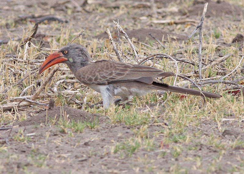 The southern yellow-billed hornbill forages on the ground for seeds, insects, spiders, and scorpions.