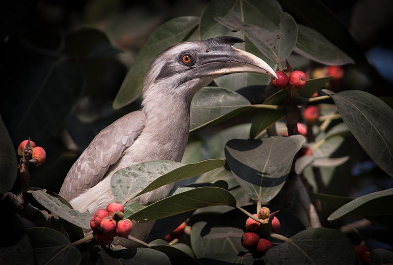 The Indian gray hornbill eats small fruits, insects, lizards, and mice.