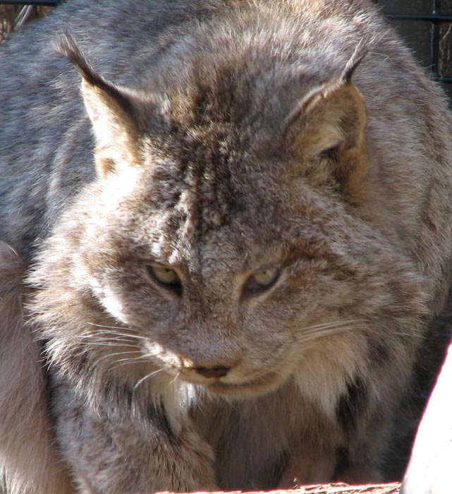 The Canada lynx has very thick, light brown or gray fur with light black spots. It has large ears with long black tufts at the ends. Its tail is short with a black tip at the end. It has a pointed, beard-like ruff and long legs with big paws. Its paws work like snowshoes and distribute the lynx's weight, helping it move in the snow.