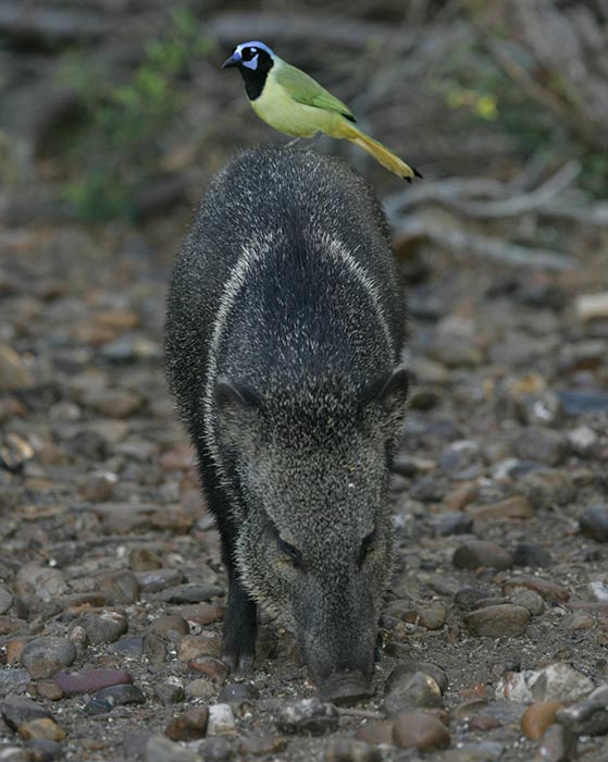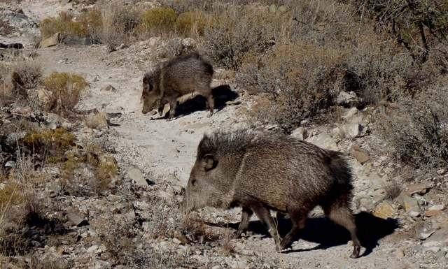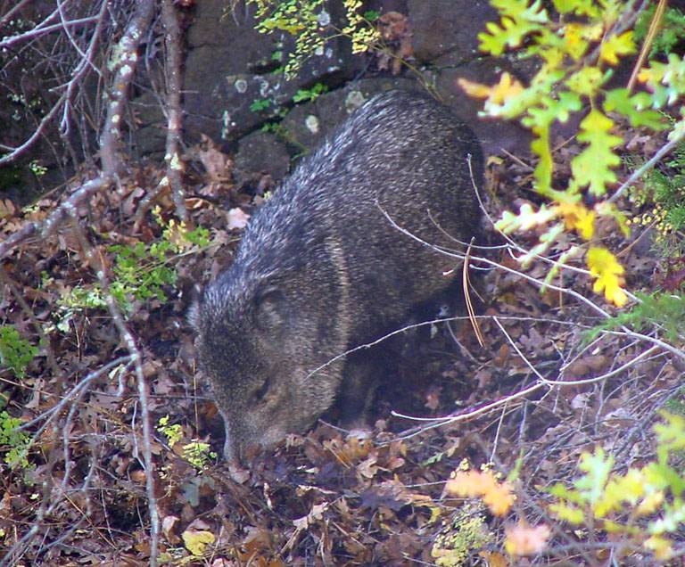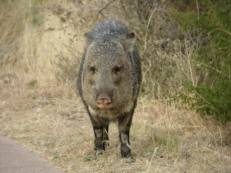 The collared peccary has a pig-like snout, a large head and shoulders, and small legs with hoofed feet. It has grizzled and bristly gray and brown fur. It has a collar of white or yellowish fur around its neck and small, straight tusks. It is 2-3 feet in length and stands about 1.5-2 feet tall. It has a musk gland at the top of its rump. It uses its musk to identify members of its group and to mark its territory. It is sometimes called the javelina.