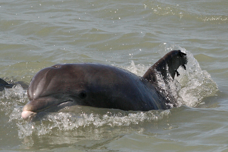 The dolphin has a wide range of vocalizations. Some scientists think they have a language. Scientists are working to see if humans can communicate with dolphins. Each dolphin also has its own unique whistling sound that it uses to identify itself. Dolphins use sound or echolocation to locate food. They have sacs in their foreheads that they use to make clicking sounds. The sounds travel through the water and when they hit something, bounce back to the dolphin.