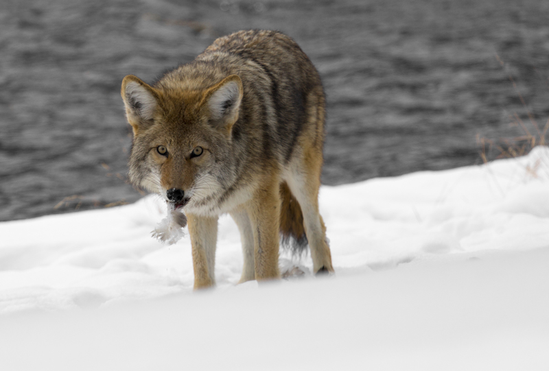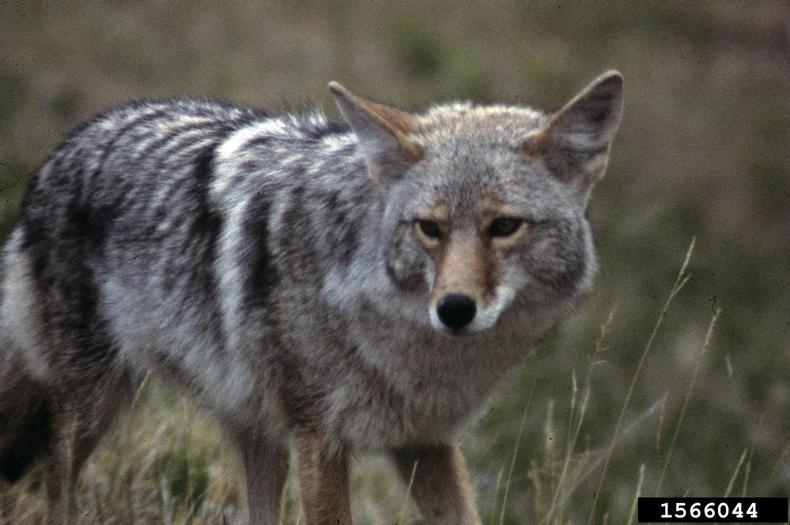 The coyote has grayish-brown to yellowish-brown fur on top and whitish fur on its underparts. It has large triangular ears on the top of its head and a long, narrow muzzle.It has a black nose; yellow eyes; and a long, bushy tail.