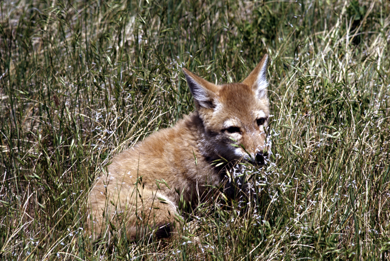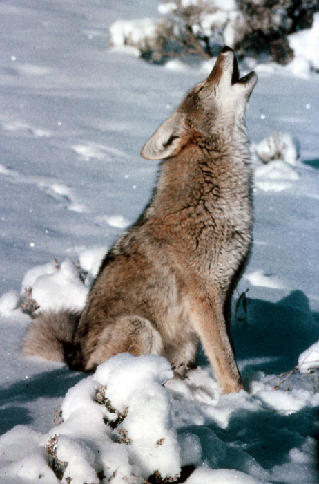 One way to tell the coyote apart from wolves and dogs is to watch its tail when it runs. The coyote runs with its tail down. Dogs run with their tails up, and wolves run with their tails straight out.