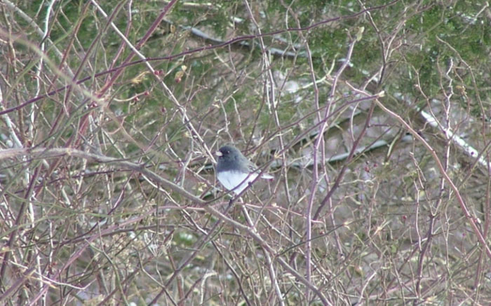 The dark-eyed junco hops on the ground in search of seeds and insects. During the breeding season, they prefer insects. In winter and during migration, they can be found at bird feeders.