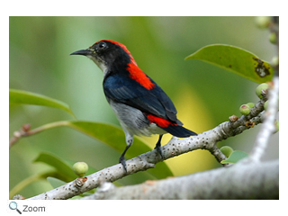 Flowerpeckers are tiny birds - about 3-4 inches in length. They have short tails and curved bills and eat nectar, berries, and insects. Most species are brown or olive in color, but the males of some species have brightly colored red or yellow patches on their crown, rump, and breast.