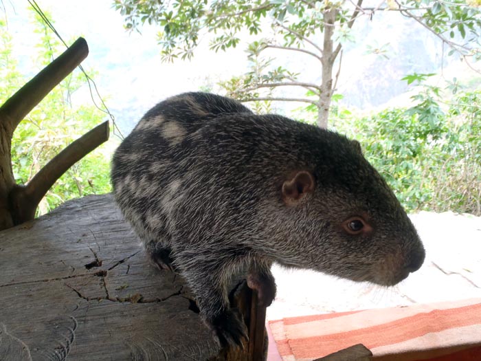 It weighs 20-30 pounds. It looks like a little like a very large guinea pig! It has a stocky body; a large head; thick, brown fur with rows of white spots; small, rounded ears; powerful legs with sharp claws; and a long, thick tail.