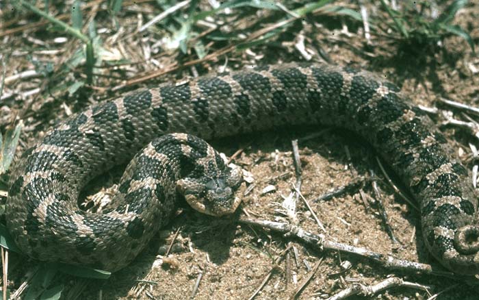 The hognose snake is sometimes called the puff adder. When it is threatened, it raises its head and puffs out and flattens the skin around its neck - like a cobra. It hisses loudly, and lunges towards the threat. It is all a show! It lunges with its mouth closed! If that doesn't work, it rolls over onto its back, open its mouth, hangs it tongue out of the side of its mouth, and plays dead. It may play dead for several minutes before carefully turning over and looking around to see if it is safe. If it is rolled back onto its belly when it is playing dead, it will roll back onto its back! |