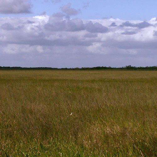 River of Grass The Florida Everglades is a saw-grass marsh. Saw-grass is a very thick grass with a sharp, saw-like edge. It grows 10-15 feet high. The basin of the Everglades is made of limestone. The limestone makes it hard for water to drain. The Everglades begin at Lake Okeechobee. When the lake overflows, water drains into the Everglades. The Everglades has a dry and a wet season. The dry season runs from December to April. During the dry season, animals that live in the water often migrate to deeper pools of water. Other species that prey on these animals will also move near the pools of water. In the wet season, which runs from May to November, rain fills in the dry areas and wildlife can be found throughout the Everglades. The water level in the Everglades can vary from just a few inches to six feet.