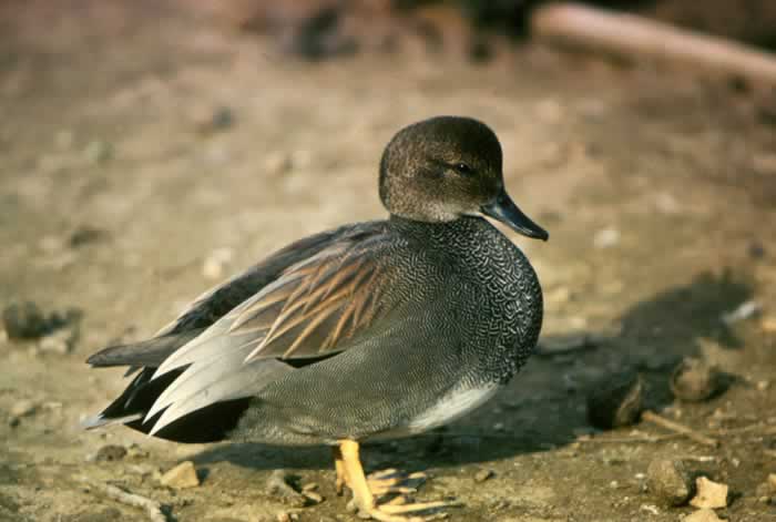 Description The gadwall is a dabbling duck that is 18-21 in length with a wingspan of 35 inches. The male is gray on his back, chest, and sides and has a brown head and a cinnamon patch on his forewing. The female is a mottled sandy-brown. Both the male and female have a white belly, a grayish-black bill, a black rump, and a white patch on the hind edge of their wings.
