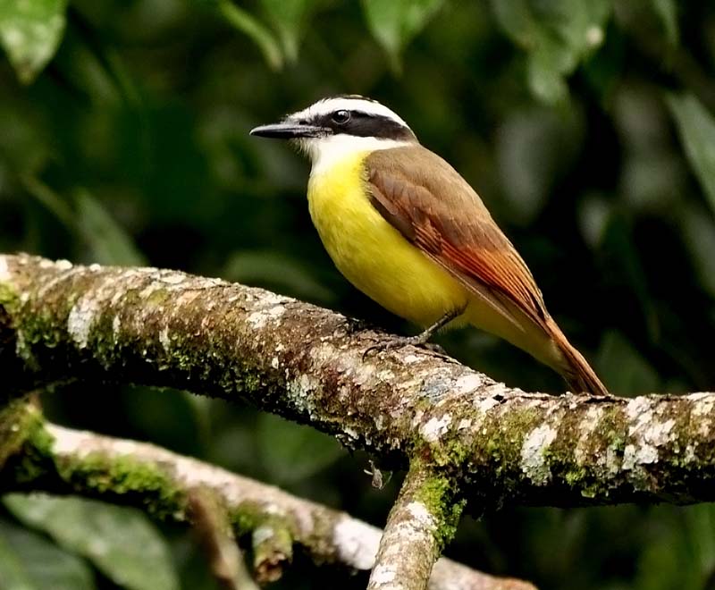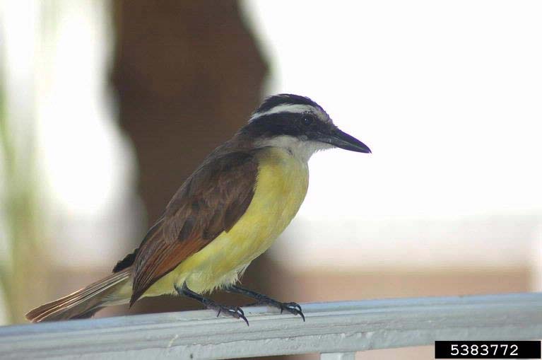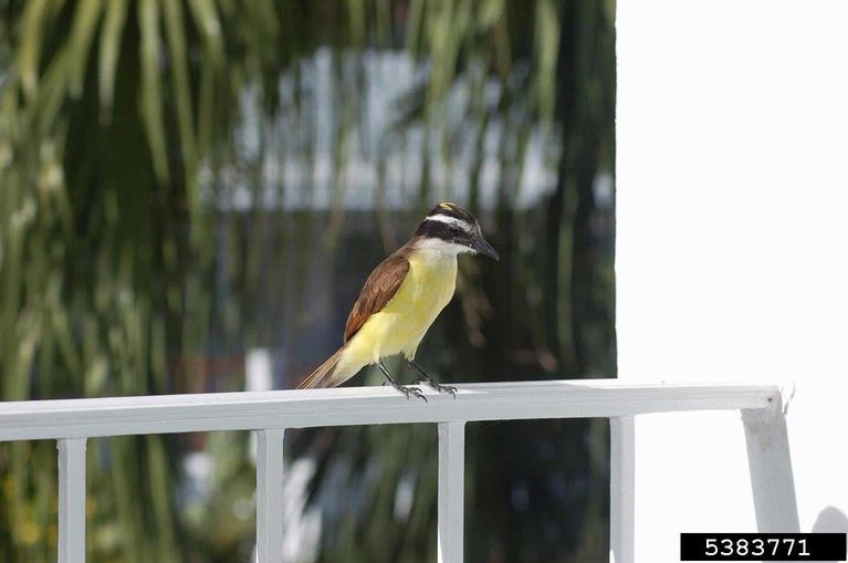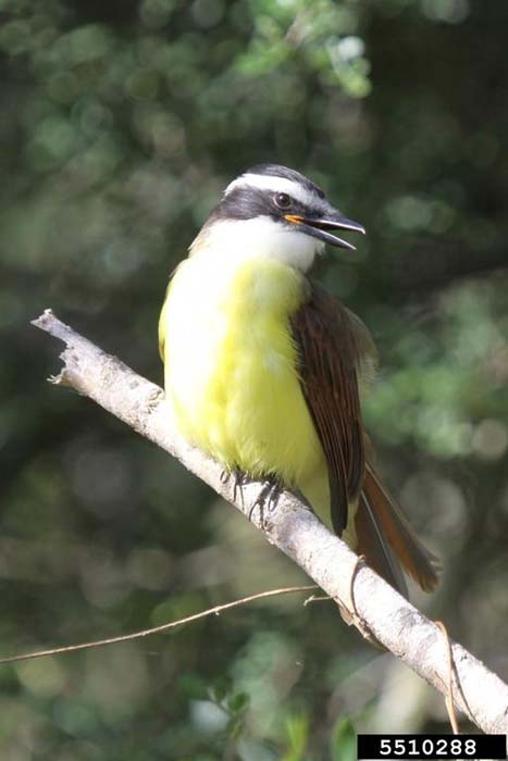 The great kiskadee is a large member of the flycatcher family. It is about ten inches in length. It has black and white stripes on the crown and sides of its head.