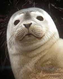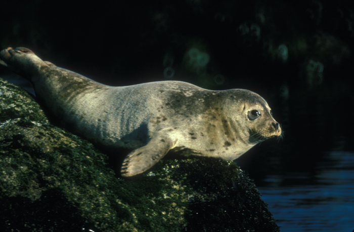 The harbor seal has a gland in its skin that secretes an oil that waterproofs its fur. It has a rounded head, a short snout, and a V-shaped nose that closes when it is under water. It has