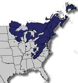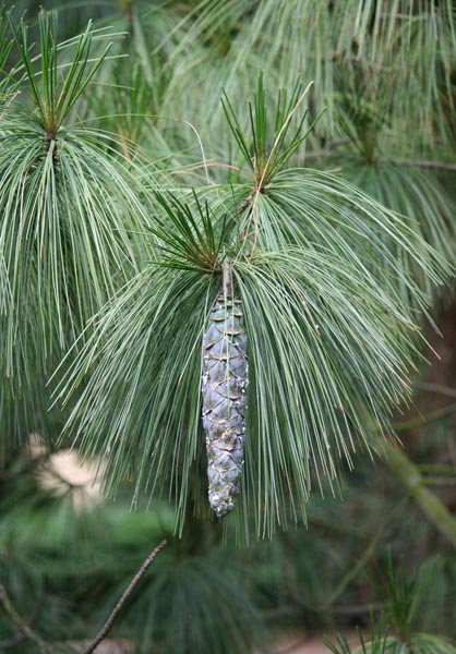 The white pine is the largest conifer in the Northeast. It has a straight trunk with a crown of horizontal branches. It can grow to be 100 feet tall and its trunk can have a diameter of 3-4 feet. It has slender, greenish-blue needles that are 2.5-5 inches long that grow in bundles of five. It has long, narrow yellowish-brown cones 6-8 inches long. The bark of the white pine is smooth and gray when the tree is young. It becomes gray-brown and deeply furrowed as the tree ages. The white pine can live to be 400 years old.