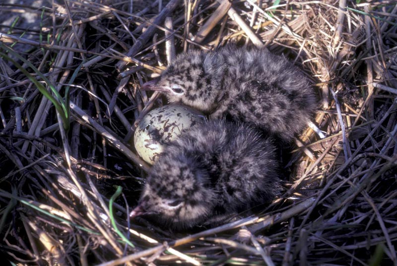 The laughing gull nests in colonies with other gulls and terns. The male and female build a platform nest of grass and weeds placed in in
