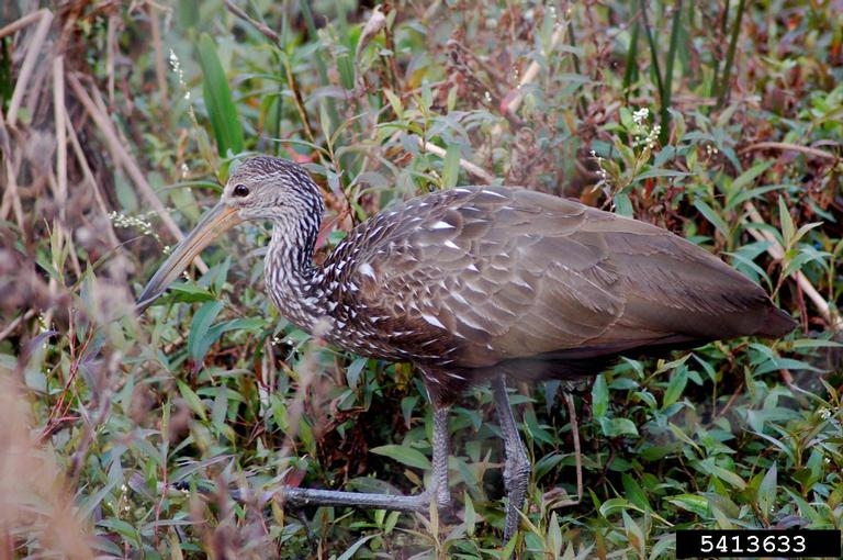 The limpkin is 23-28 inches in length with a wingspan of about 42 inches. It has long legs and a long neck. It has brown and gray feathers with white spots and streaks. Its long, pointed bill is slightly curved and is yellow with a black tip.