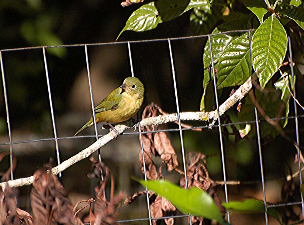 The female painted bunting is bright yellow-green with paler underparts. Both the male and the female have dark brown or black wings, a dark bill, and dark legs.