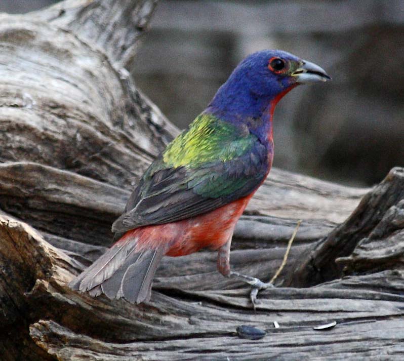The painted bunting forages on the ground and in low vegetation for seeds, insects, spiders, and snails.