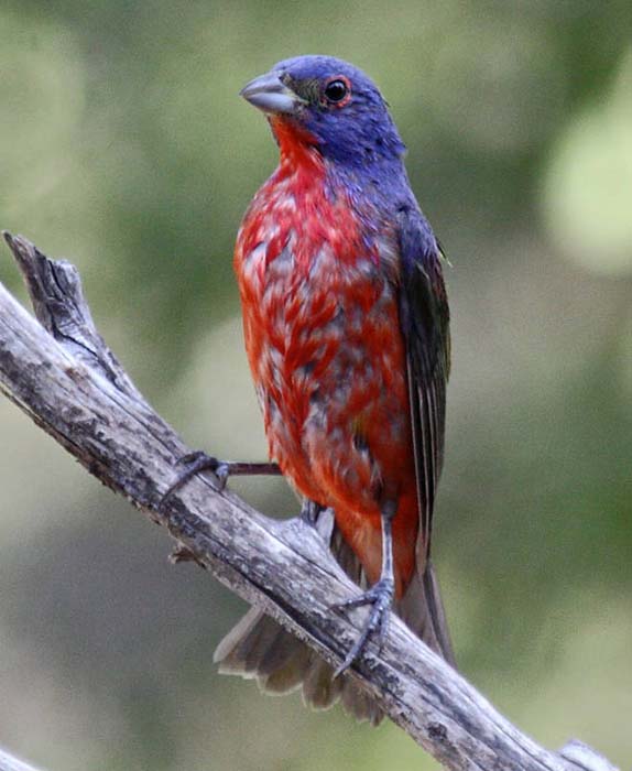 The painted bunting is a sparrow-sized bird, about 5.5 inches in length. It is one of the most colorful birds in North America. The male has bright red underparts and a bright red rump. It has a green back, a blue head, and a red eye ring.