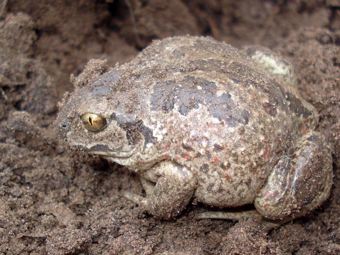 There are four species in this family. Spadefoot toads get their name from the hard, sharp, bony "spade" on their hind feet. they use this spade to dig backwards into sandy soil to create burrows.