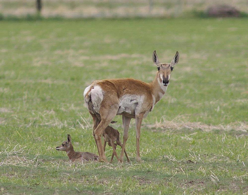 In the southern part of their range, pronghorns mate in the late summer. In the northern part of their range, they mate in the early fall. Males will fight over females. A male may mate with more than one female. The female gives birth to one to two fawns in late May or early June.