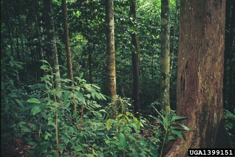 Trees in the tropical rainforest can grow very tall. Leaves are usually thick and have pointed "drip tips" to help rain roll off them. Tree trunks are wide and flared and tree bark is thin and smooth. Some trees even have roots that are above the ground.