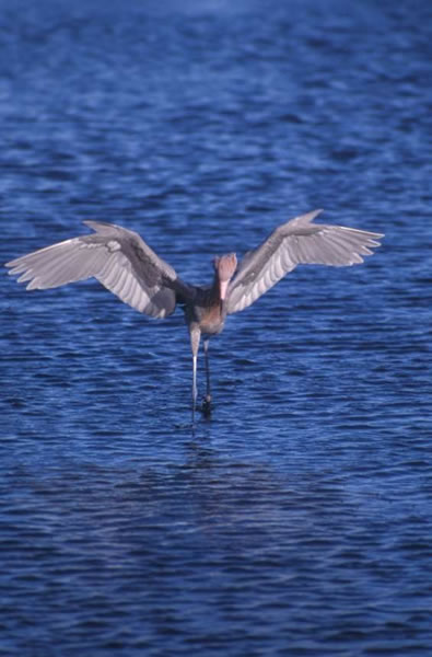 HabitatThe reddish egret is found in areas with salty or brackish water. Habitats include coastal tidal flats, salt marshes, and lagoons. DietWhen the reddish egret hunts for food, it races back and forth in the shallow water, often spreading its wings wide and flapping them. It eats fish, frogs, and crustaceans. Sometimes it curves its wings forward around its body and makes a canopy that casts shade on the water. When prey swims towards the shady spot, the reddish egret quickly snatches it up. Life Cycle