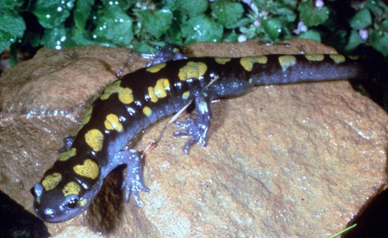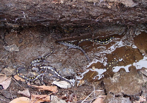 DietThe spotted salamander uses its sticky tongue to catch worms, insects, and snails. Life Cycle The spotted salamander usually moves to breeding ponds at night during the first rain after the winter thaw. Males arrive at the breeding ponds first. The female lays one or more egg masses covered with a jelly-like substance. Each egg mass contains about 100 eggs. The egg masses stick to submerged branches and other objects. The larvae hatch in 1-2 months, depending on the water temperature. Young larvae eat zooplankton and insect larvae and, sometimes, other spotted salamander larvae. The larvae become salamanders in 2-4 months. BehaviorThe spotted salamander spends most of its time underground. It needs areas with soil that is easy to burrow into. Some spotted salamanders can live to be 30 years old! |