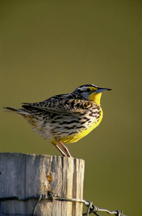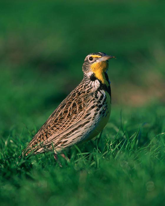 Description The western meadowlark is very similar to the eastern meadowlark. The western meadowlark's yellow color extends a little further onto its cheek. The songs of the two meadowlarks are the easiest way to tell them apart. The song of the western meadowlark is a series of flute-like gurgling notes that go down the scale. The eastern meadowlark's call is a simpler series of whistles. Range | HabitatThe western meadowlark lives in meadows, plains, prairies, and other open grasslands. DietThe meadowlark's diet is mostly insects like caterpillars, and grasshoppers, although it sometimes eats seeds. Life Cycle